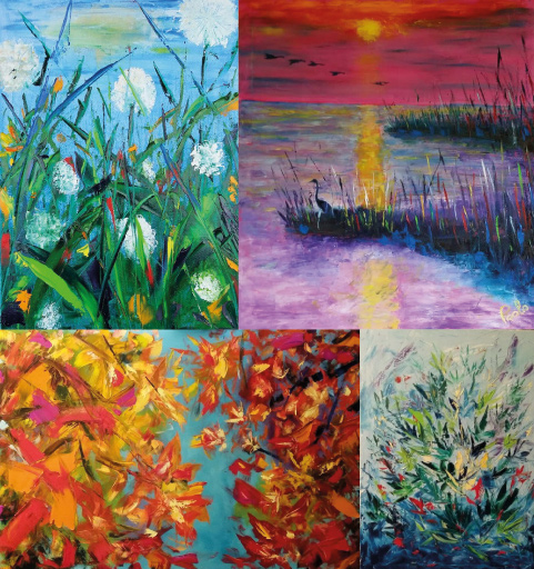 In "Papaveri" è il rosso a spingerci verso l'alto con lo sguardo e la fantasia,mentre in "Giungla" dobbiamo apprezzare l'intreccio cromatico e l'incedere del segno che tutto avvolge. Gli "Aironi nel tramonto" sono speciali e affascinanti come una "Tarda primavera" che si coniugherà con un "Plenilunio di luglio" in cui potrai distinguere il passo lungo della notte che arriva con il suo respiro affannato per quel caldo che l'accompagna quasi diligente approccio al buio assoluto.