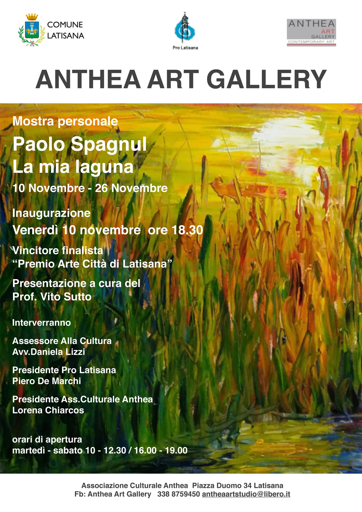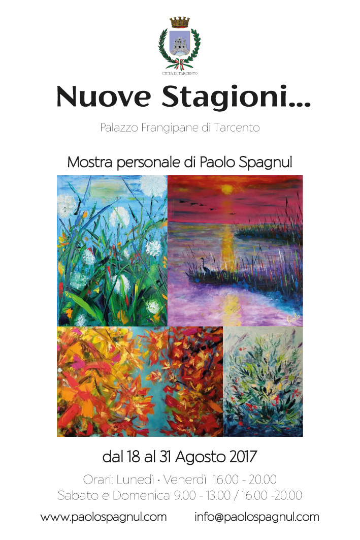 La laguna dell'esistenza trasuda di una stagionalità che supera i limiti del tempo stesso, non è autunno (ma lo è) non è inverno, ne' primavera ne' estate ma allo stesso tempo tutto cio'. Scoprire la natura dunque induce Paolo Spagnul a richiamare se stesso alla dolce illusione che la vita sia senza tempo, perche' è vero che se "panta rei" è altresi vero che la vita dona se stessa un numero innumerevole di volte e che l'infinitesima parte di un tramonto diventa la ripetizione di milioni di giorni e l'attesa spasmodica di altri milioni di anni in cui noi, io, il pittore, tu che guardi questa mostra, potremmo non esserci ma la natura ci sarà ancora fino a che un altro evento epocale la cambierà e la farà essere cio' che noi ora non possiamo sapere.